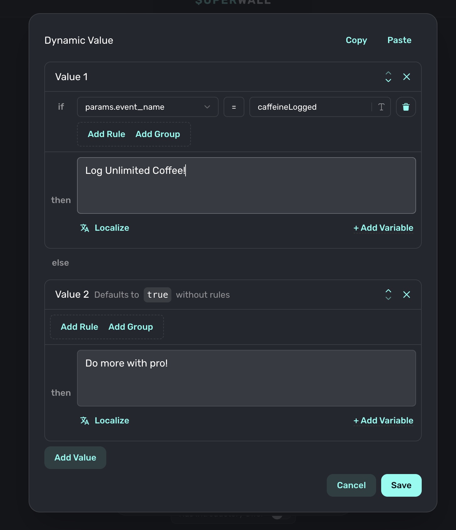 Triggered by: {{ event_name }}But, more commonly, you might use it with a dynamic value. Then, you can customize your paywall based on the event name: