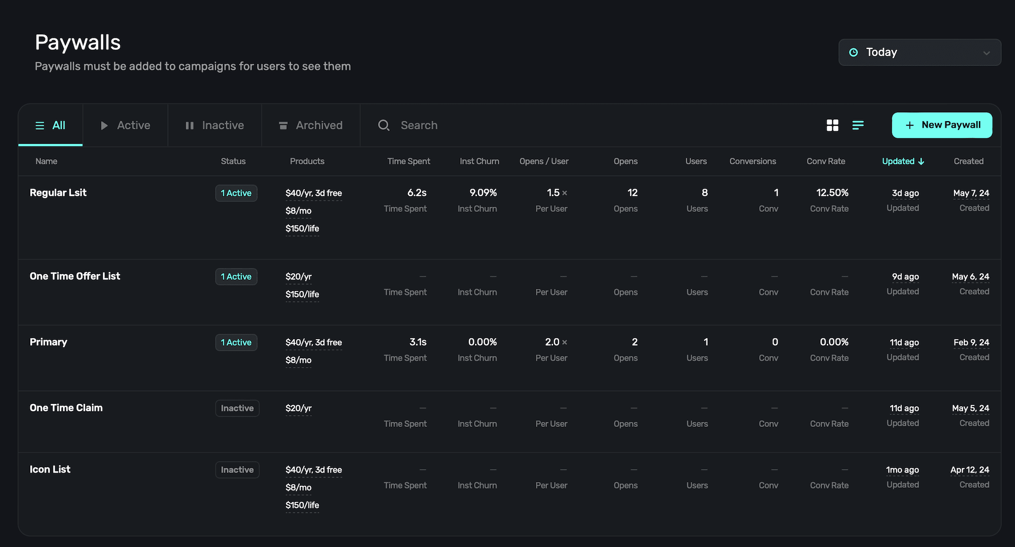 Choose the list view to see high-level metrics about each paywall: