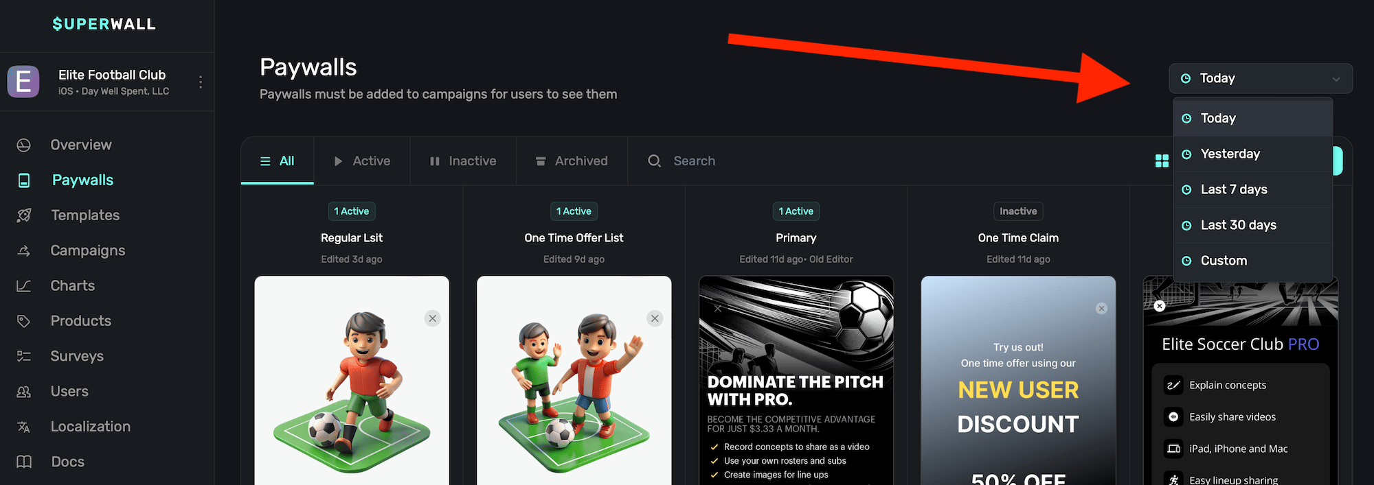 You can toggle which paywalls are showing by using the date toggle, located above your paywalls towards the top-right:
