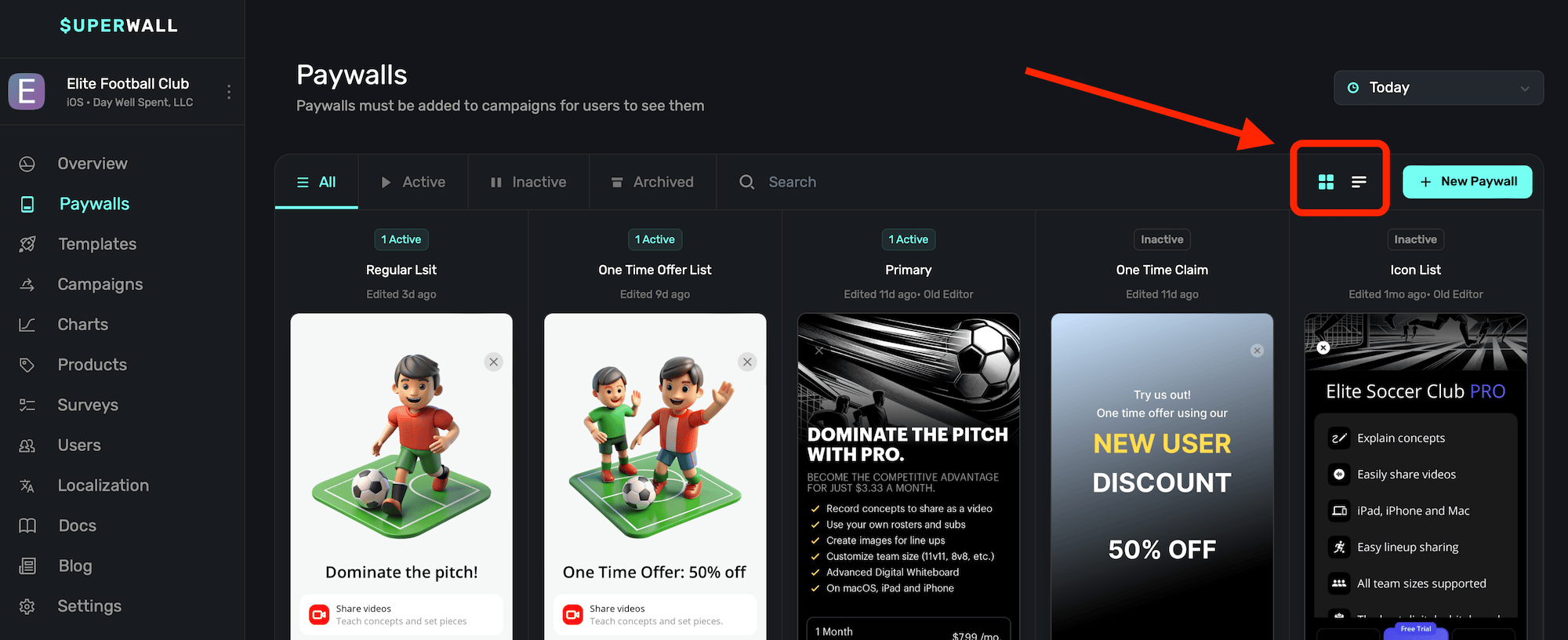 To toggle between viewing your paywalls by either a table or list, click the toggle buttons at the top: