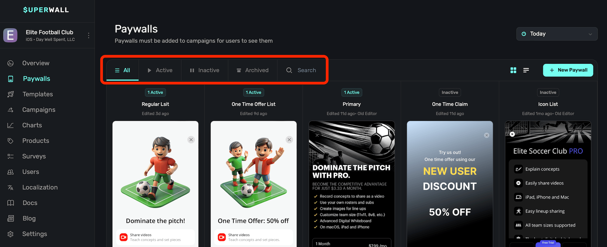 | Inactive | Paywalls which are not being displayed. They are not associated with any active campaign, or their rollout percentage is 0. |