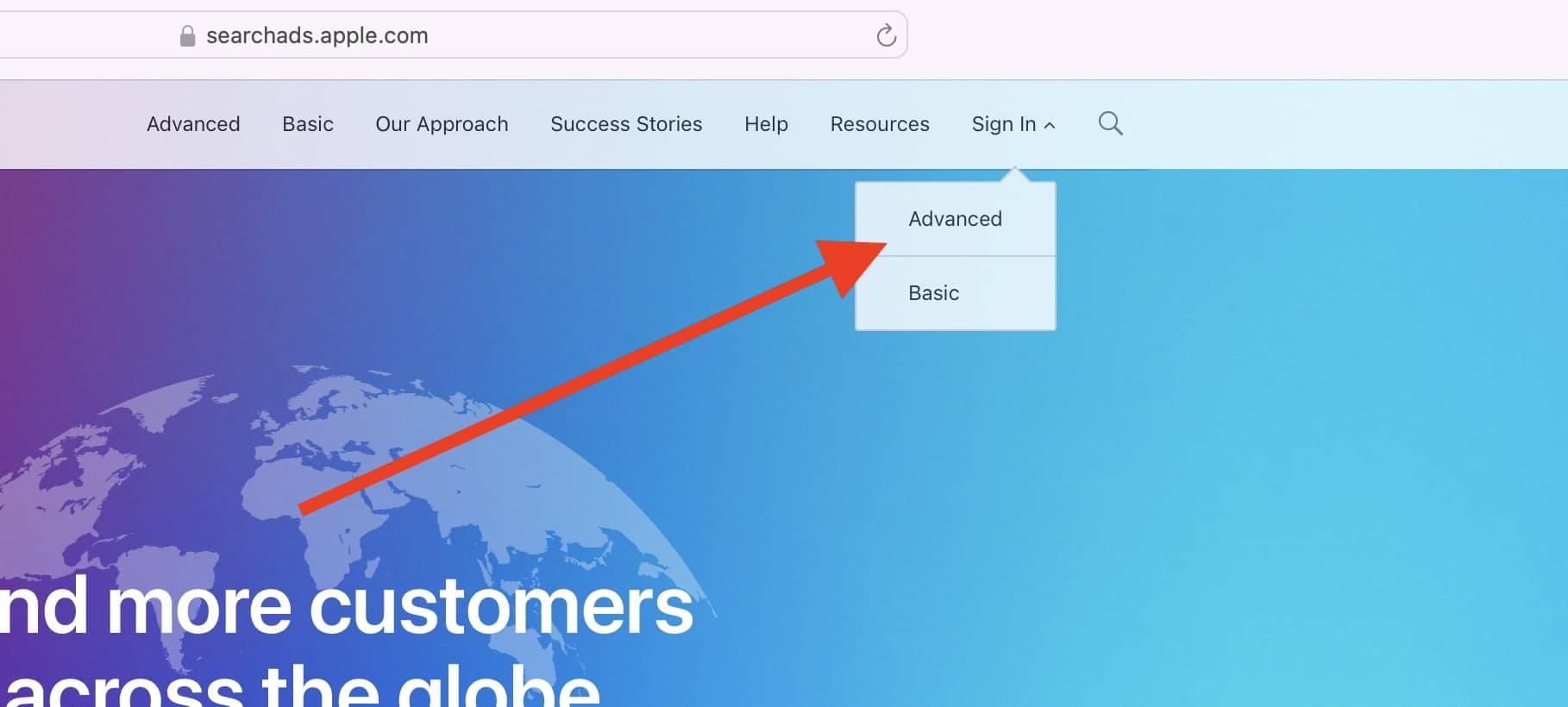 1. Go to searchads.apple.com and click Sign In -> Advanced.