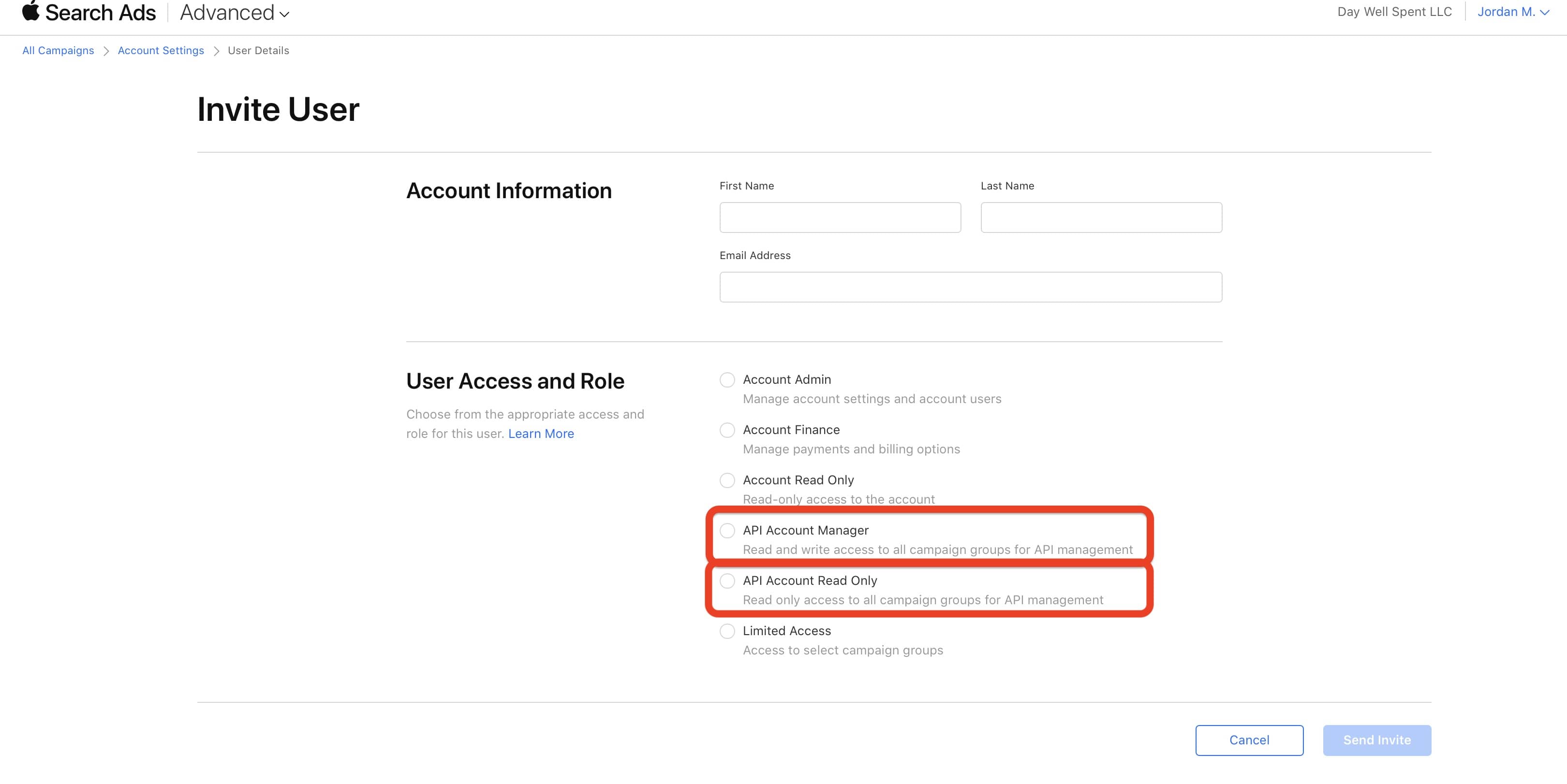 • First, you'll need to create a user in Apple Search Ads using a different Apple Account than your primary Apple Account.