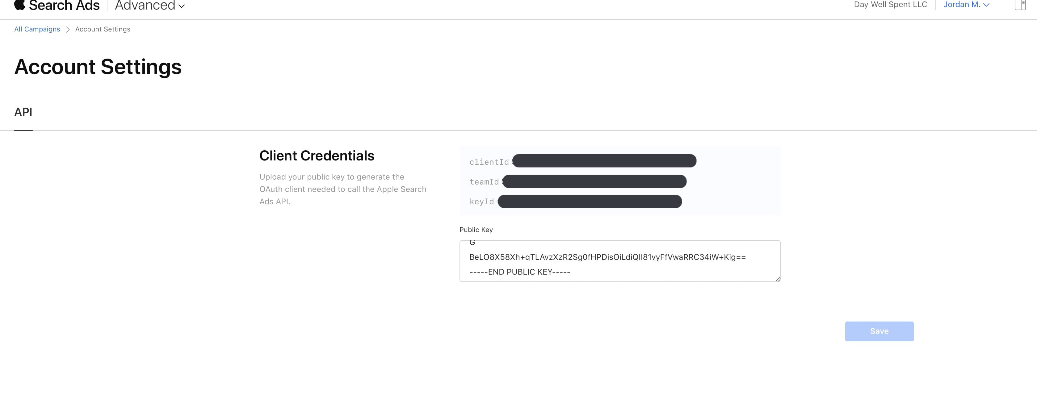 4. Back in Apple Search Ads, paste the public key under Public Key and click Generate API Client: