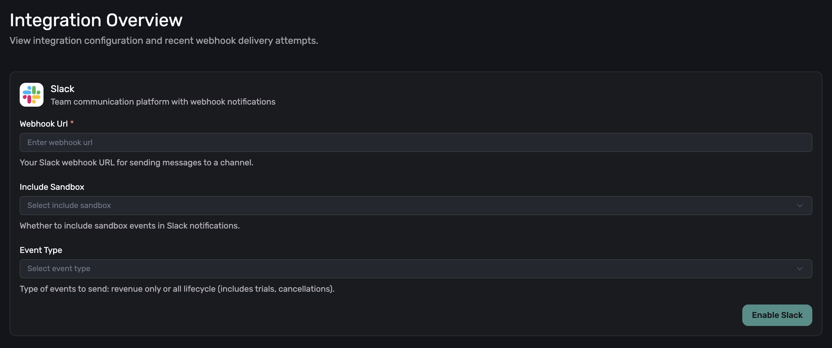 • Include Sandbox: Whether to include sandbox events in Slack notifications.
