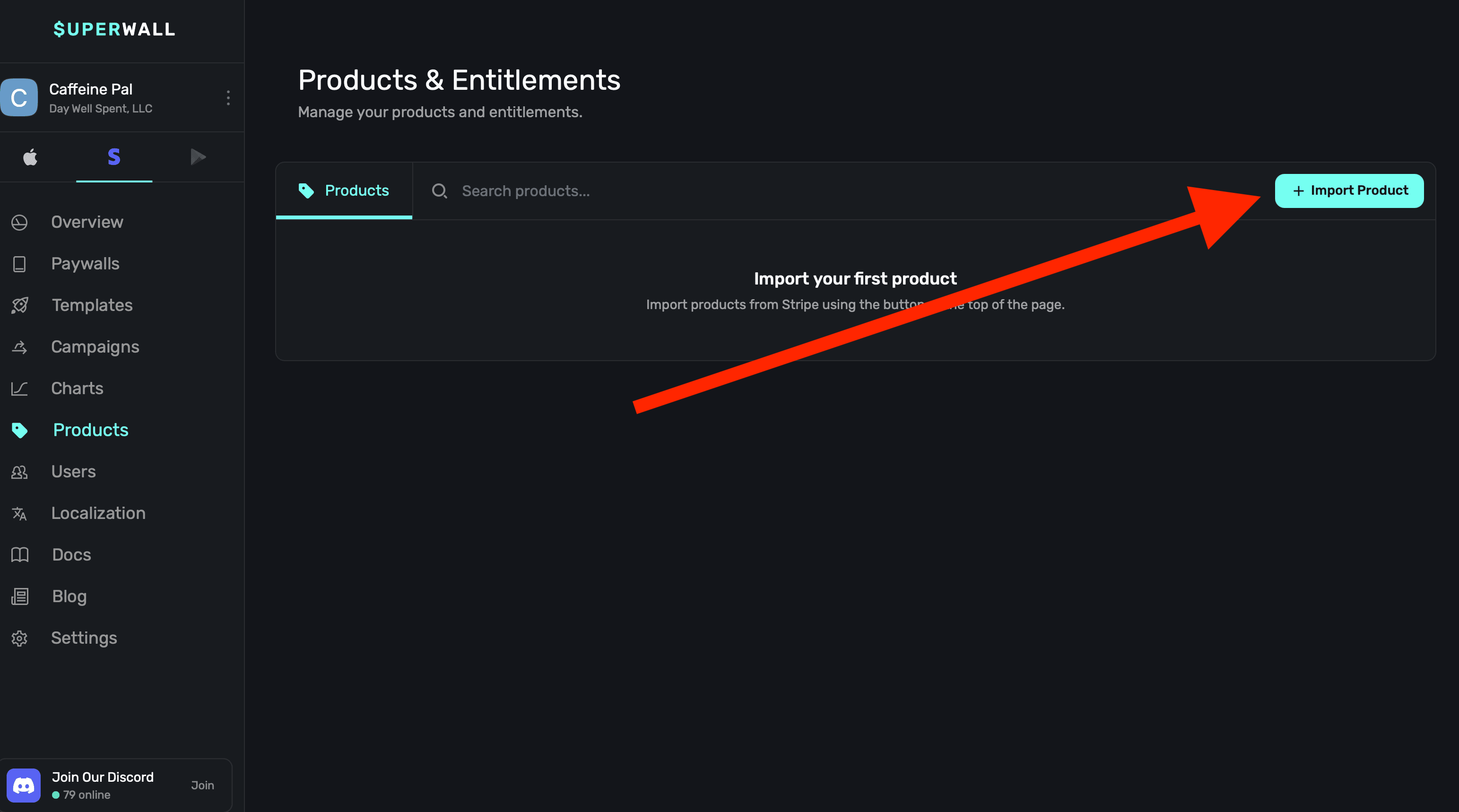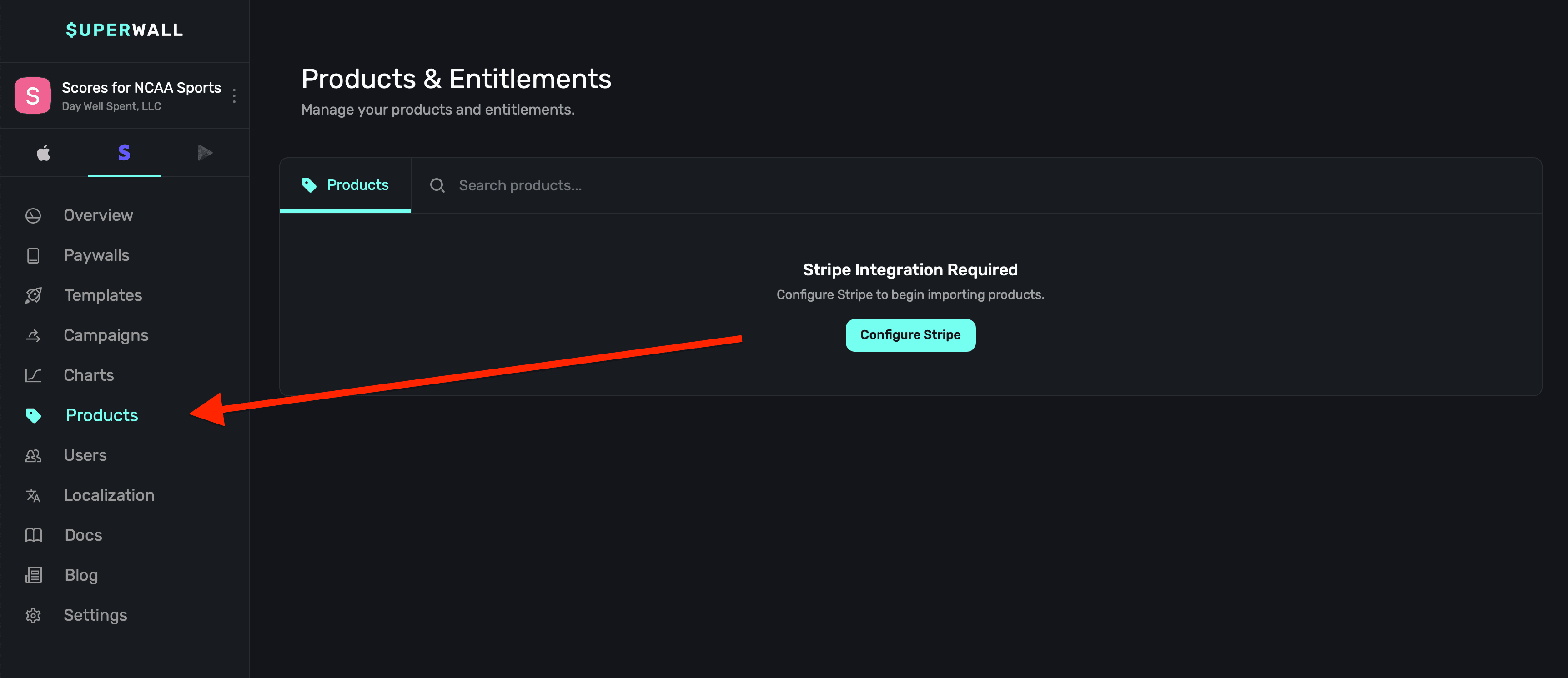 Once your app is configured with Stripe, you can create products to show on your web paywalls. To get started, click on Products from the overview page: